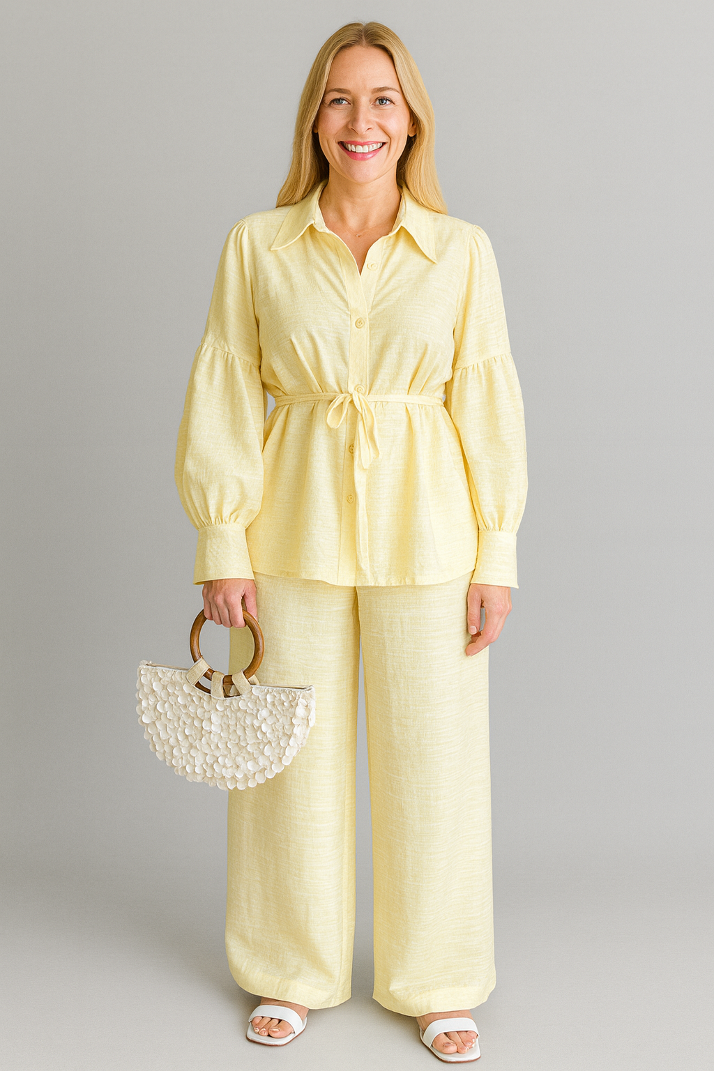 Das Lynn Zweiteiler-Set wurde entworfen, um alltägliche Eleganz mit maximalem Komfort zu vereinen. Mit einer lockeren Bluse mit Taillenband und weit geschnittenen Hosen schafft dieses Set eine fließende Silhouette, die schickes Design mit entspanntem Tragekomfort kombiniert – perfekt für lässige Tage oder elegante Abende.